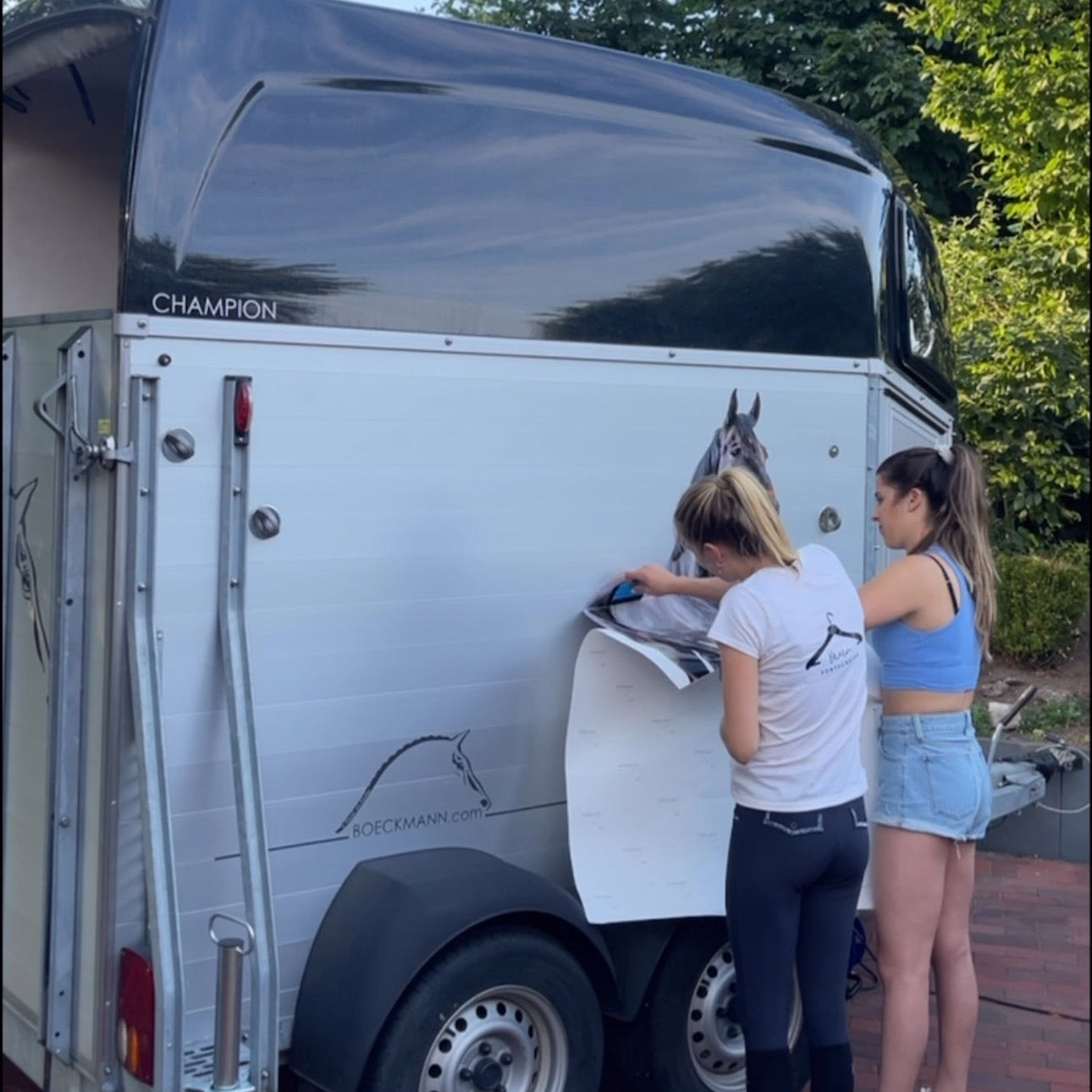 Mehr Eyecatcher geht wirklich nicht! Mit unserem individuellen Fotosticker ohne Hintergrund machst du deinen Pferdeanhänger, Pferdetransporter oder sogar LKW zum absoluten Hingucker – auf dem Hof, auf der Straße und natürlich auf dem Turnierplatz. 💥